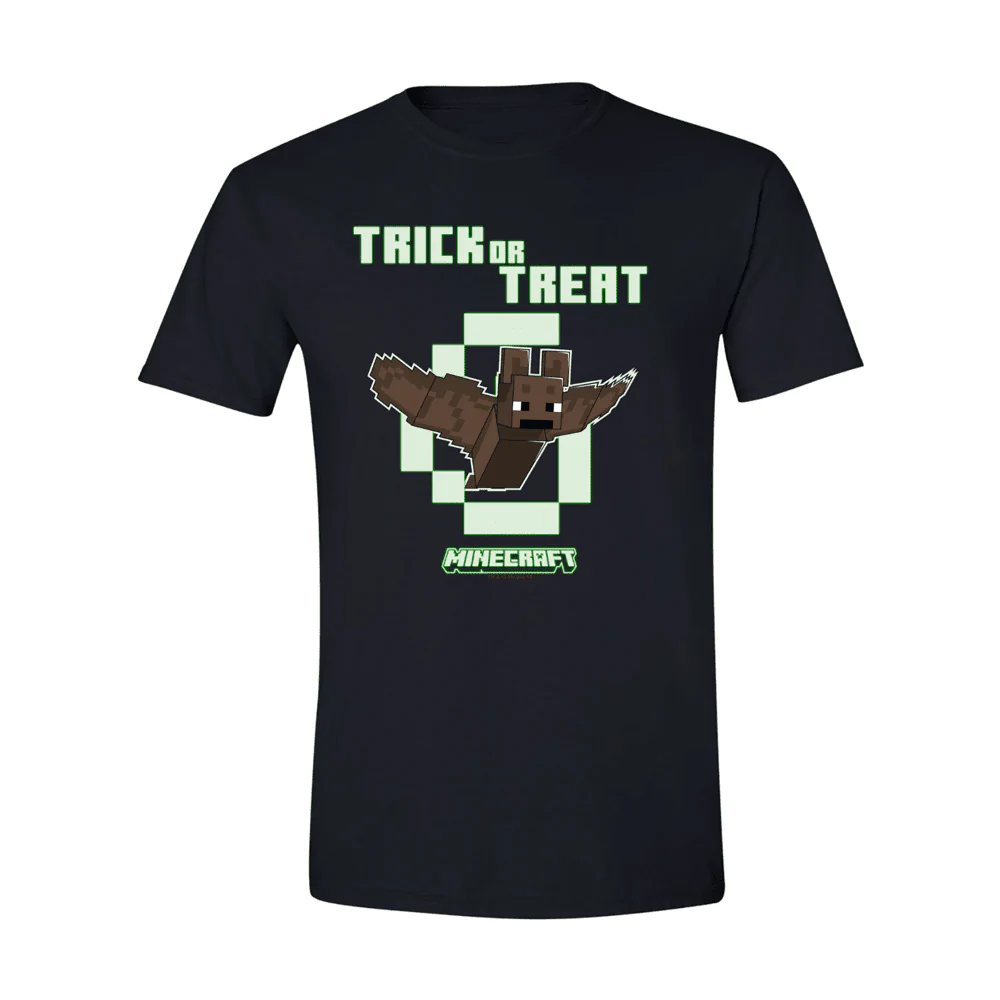 Featuring a Minecraft Bat, this Minecraft Bat Trick or Treat Glow in the Dark Adult T-Shirt is recognizable by any Minecraft fan! Made with comfortable and glow in the dark material, this tee is fantastic add to any gamer's collection.