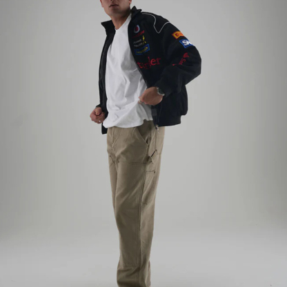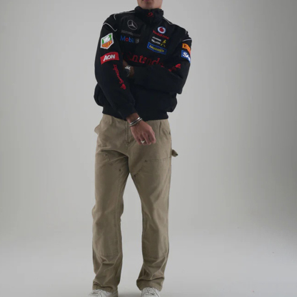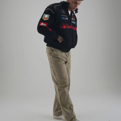 • Design Elements: Multiple logos, drawstring waist, hooded design
